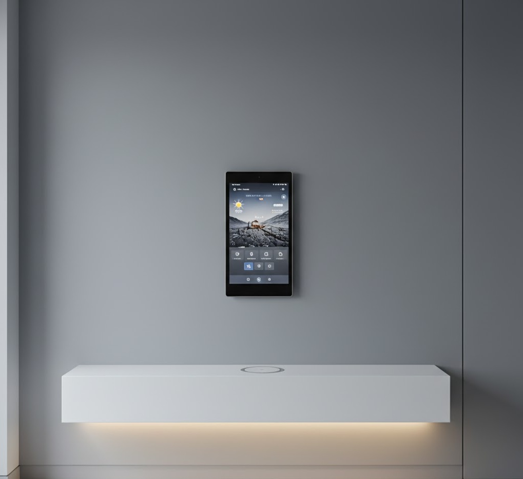 A smart tech entryway wall seamlessly integrates modern technology into the design, offering convenience and futuristic functionality. This style might feature smart displays, integrated lighting controls, keyless entry systems, or discreet charging stations. Materials are typically sleek and contemporary, such as polished metals, glass, and smooth laminates, often in a minimalist aesthetic. The colour palette is usually neutral, with whites, greys, and blacks, allowing the technology to blend in or stand out as a design feature. Functionality is highly advanced, providing a streamlined and efficient entry experience. This entryway wall idea creates a modern, efficient, and forward-thinking mood.