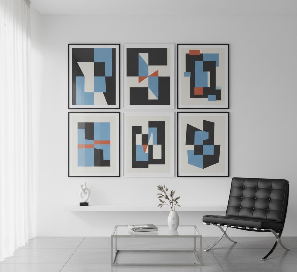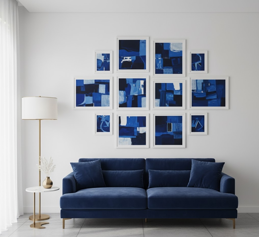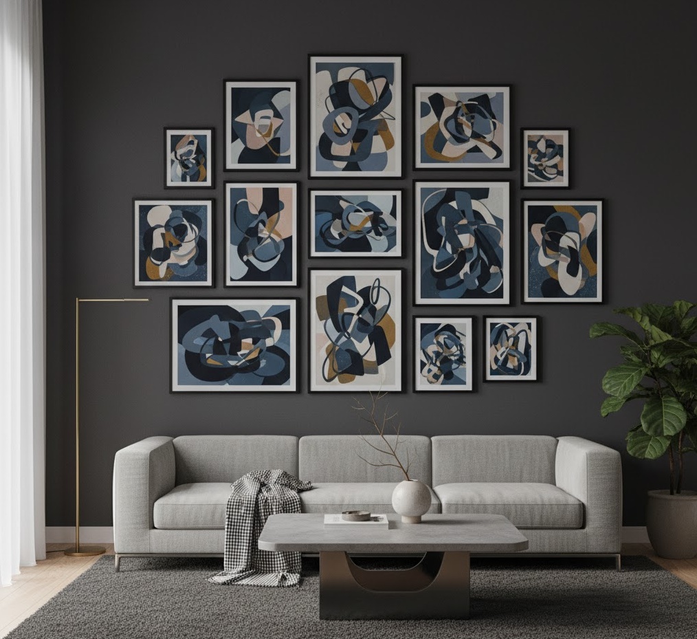 An abstract art gallery wall in the living room introduces a sophisticated and thought-provoking element, focusing on form, colour, and texture rather than literal representation. This style features a collection of abstract paintings, prints, or mixed media pieces, creating a modern and artistic mood. The colour palette can be bold and vibrant or subtle and harmonious, depending on the desired impact, often playing with contrasting shapes and lines. Frames are typically sleek and minimalist, in black, white, or natural wood, allowing the artwork to speak for itself. This gallery wall living room design is highly functional for adding contemporary elegance and stimulating visual interest without being overtly narrative.