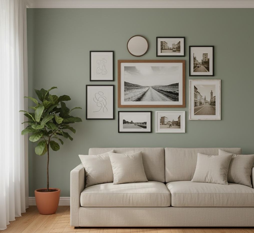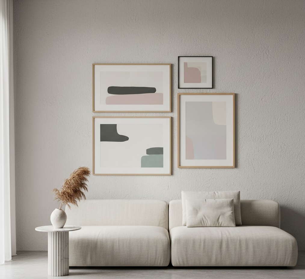 A minimalist living room gallery wall embraces simplicity and clean lines, creating a serene and uncluttered aesthetic. This style typically features a limited number of art pieces, often with a consistent colour palette of neutrals like white, grey, or muted pastels, framed in sleek, understated frames. The focus is on negative space and the thoughtful placement of each element, ensuring functionality and a calming mood. Materials are usually natural and refined, such as light wood, metal, or simple canvas prints, contributing to a sophisticated yet unfussy living room gallery. This approach ensures the gallery wall enhances the room without overwhelming it, perfect for a modern, tranquil home.