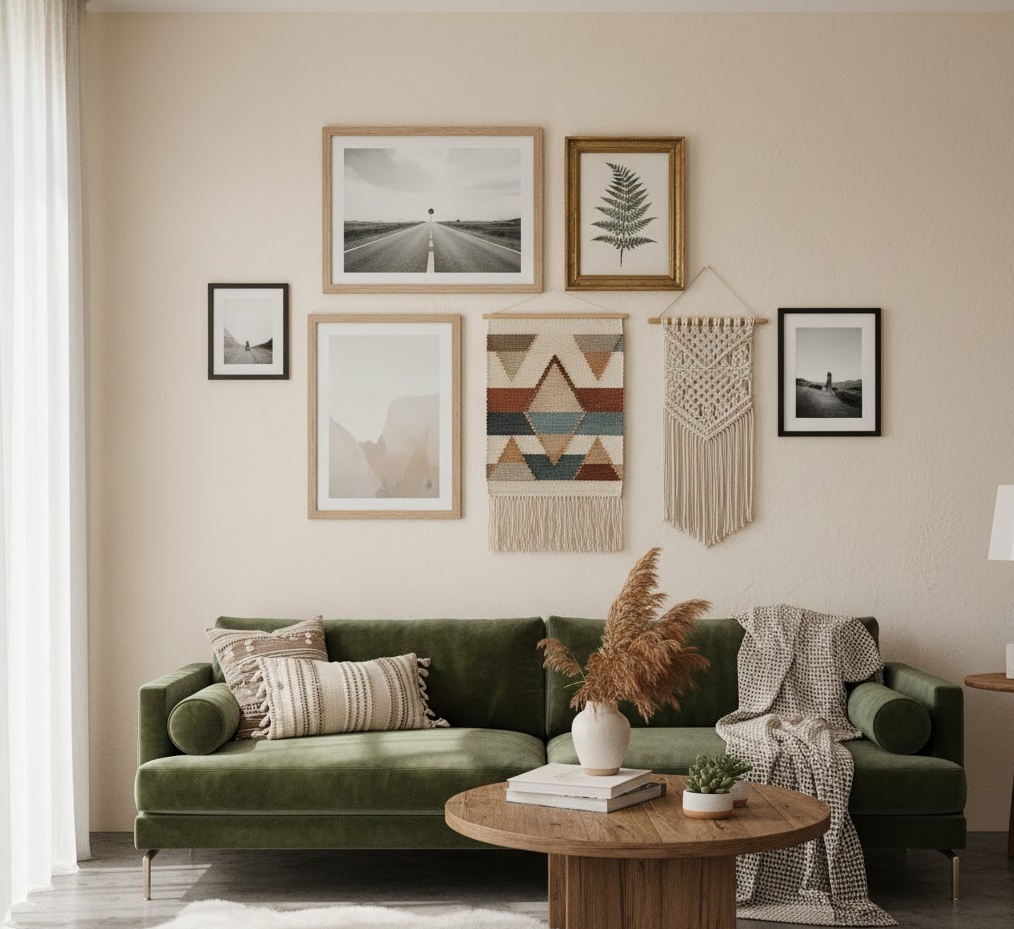 A boho chic gallery wall in the living room exudes a relaxed, free-spirited vibe, blending global influences with natural textures. This style often incorporates a diverse mix of art, including woven tapestries, macramé hangings, travel photographs, and botanical prints, all contributing to a warm and inviting mood. Frames can vary widely, from distressed wood to ornate vintage finds, or even frameless pieces, creating an eclectic yet cohesive display. Earthy tones, terracotta, deep greens, and warm yellows dominate the colour scheme, complemented by natural materials like rattan, jute, and linen in the surrounding decor. This gallery wall living room design fosters a cosy, well-travelled atmosphere, perfect for creative expression.