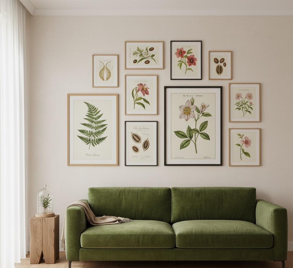 A botanical gallery wall decor in the living room brings the beauty of the natural world indoors, fostering a fresh and tranquil environment. This style exclusively features prints of plants, flowers, leaves, and scientific illustrations, creating a serene and organic mood. The colour palette often includes lush greens, earthy browns, and delicate floral hues, set against neutral backgrounds. Frames are typically natural wood, white, or thin black, allowing the intricate details of the botanical subjects to shine. This gallery wall living room design is highly functional for adding a touch of nature and calm, perfect for creating a refreshing and visually appealing focal point.