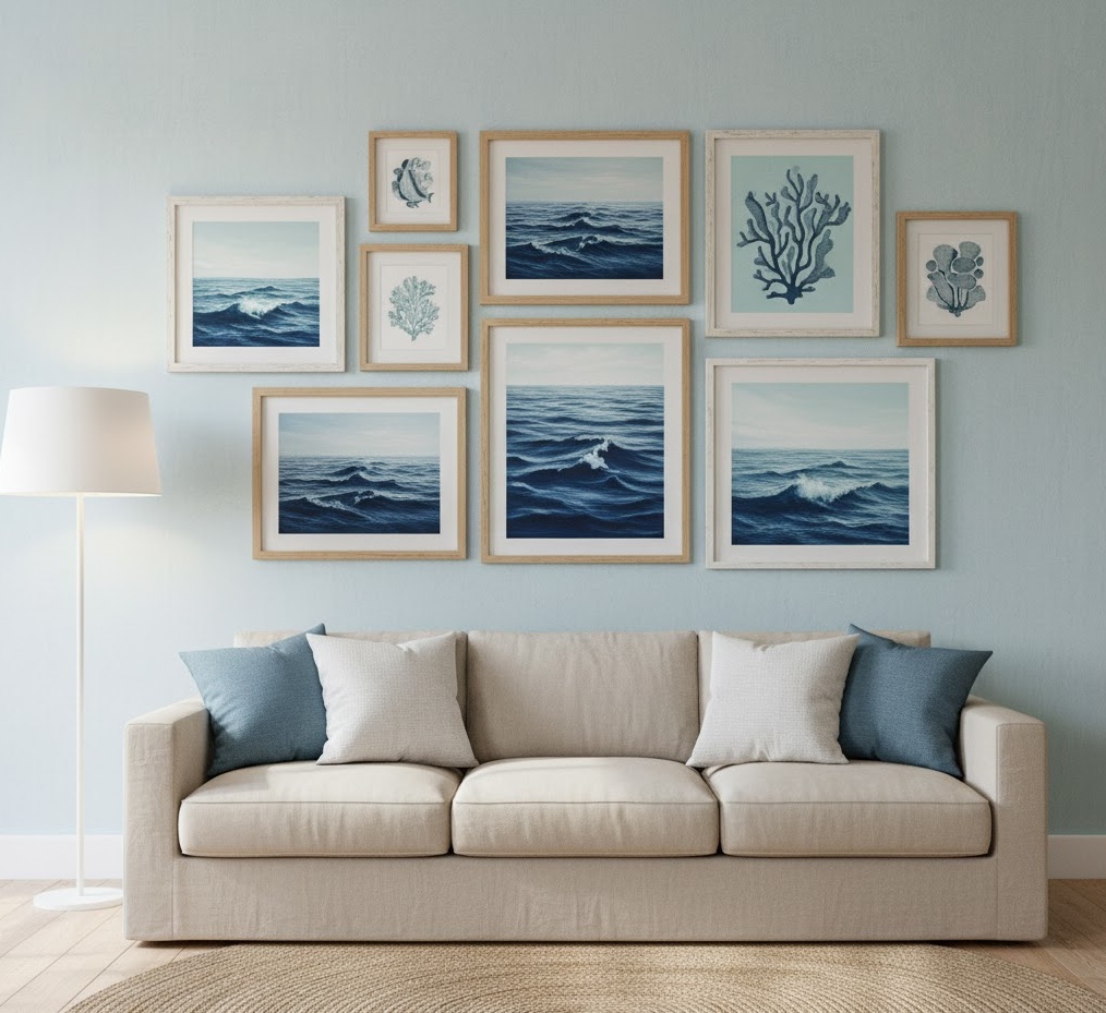 A coastal gallery wall in the living room brings the serene and refreshing essence of the seaside indoors, creating a calm and airy atmosphere. This style often features artwork depicting seascapes, marine life, shells, or abstract pieces in ocean-inspired hues. The colour palette is dominated by blues, whites, sandy beiges, and soft greens, evoking a tranquil, beach-house mood. Frames are typically light wood, white, or distressed finishes, complementing the natural, relaxed aesthetic. Materials like driftwood, linen, and woven textures enhance the coastal feel. This gallery wall living room design is highly functional for creating a peaceful retreat, perfect for unwinding and dreaming of the ocean.