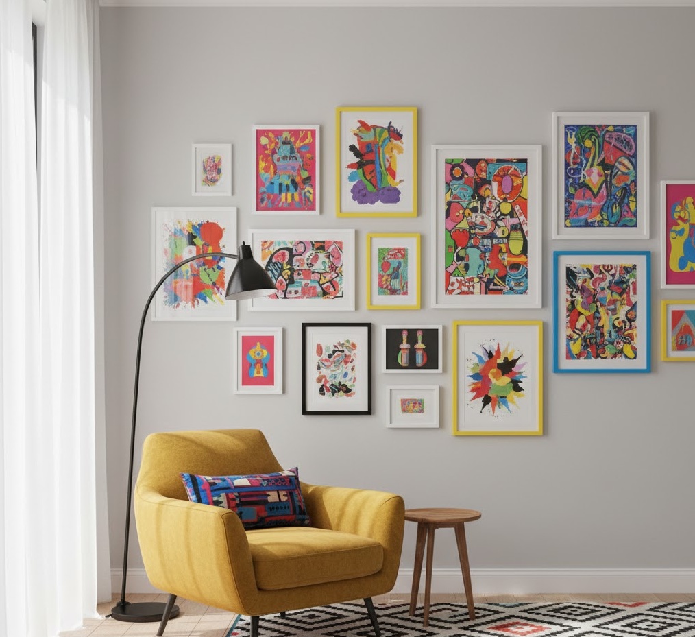 A colourful living room gallery wall is a vibrant explosion of hues, designed to inject energy and personality into the space. This bold style embraces a diverse palette, featuring artworks with bright, contrasting colours, playful patterns, and dynamic compositions. The mood is undeniably cheerful and uplifting, making it a fantastic focal point in any living room. Frames can be consistent to provide some structure, or varied to enhance the eclectic feel, often in white, black, or even brightly painted finishes. This gallery wall living room design is highly functional for expressing individuality and creating an engaging, joyful atmosphere that truly stands out.