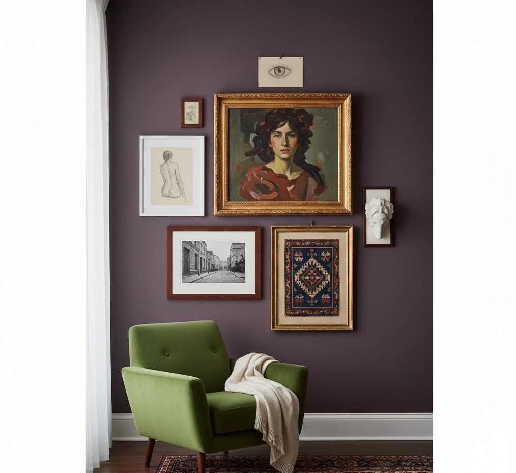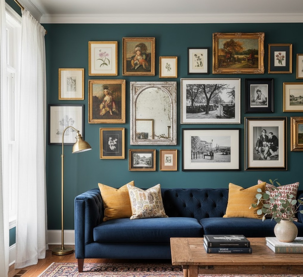 A mixed media gallery wall in the living room is a creative and expressive display that combines various artistic forms beyond traditional prints. This dynamic style might include paintings, drawings, photographs, small sculptures, textiles, and even found objects, creating a rich tapestry of textures and narratives. The mood is often artistic, personal, and highly engaging, reflecting a collector’s passion and diverse interests. Frames can vary wildly in style, material, and colour, adding to the eclectic charm and visual depth. This gallery wall living room design is highly functional for showcasing a truly unique collection, transforming the wall into a vibrant, multi-dimensional story.
