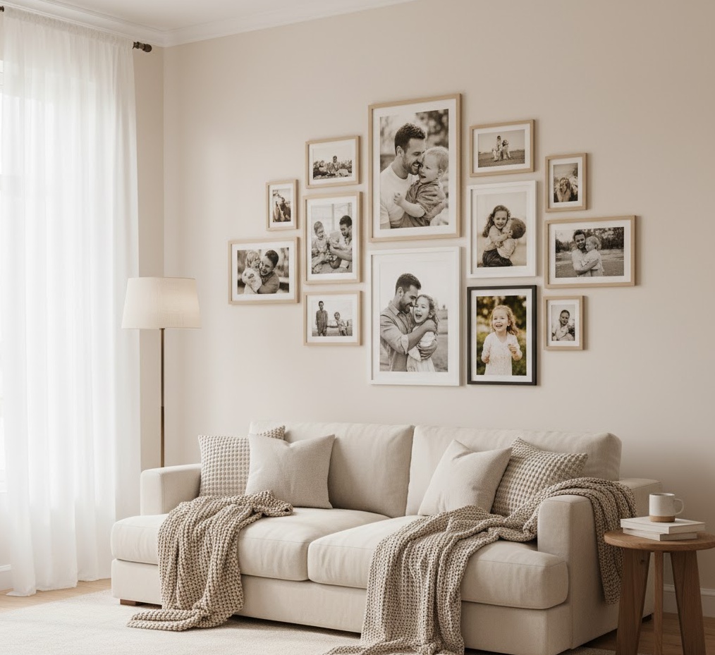 A family photo gallery wall in the living room transforms personal memories into a heartwarming and inviting display, making the space feel truly lived-in and loved. This style focuses exclusively on photographs of family members, special occasions, and cherished moments, creating a deeply sentimental and personal mood. Frames often vary in size and style, from classic wooden to modern metallic, allowing for an organic, evolving arrangement. Black and white photos can create a timeless look, while colour photos add vibrancy and warmth. This gallery wall living room design is highly functional for personalising a home, fostering a sense of connection and belonging within the main communal area.