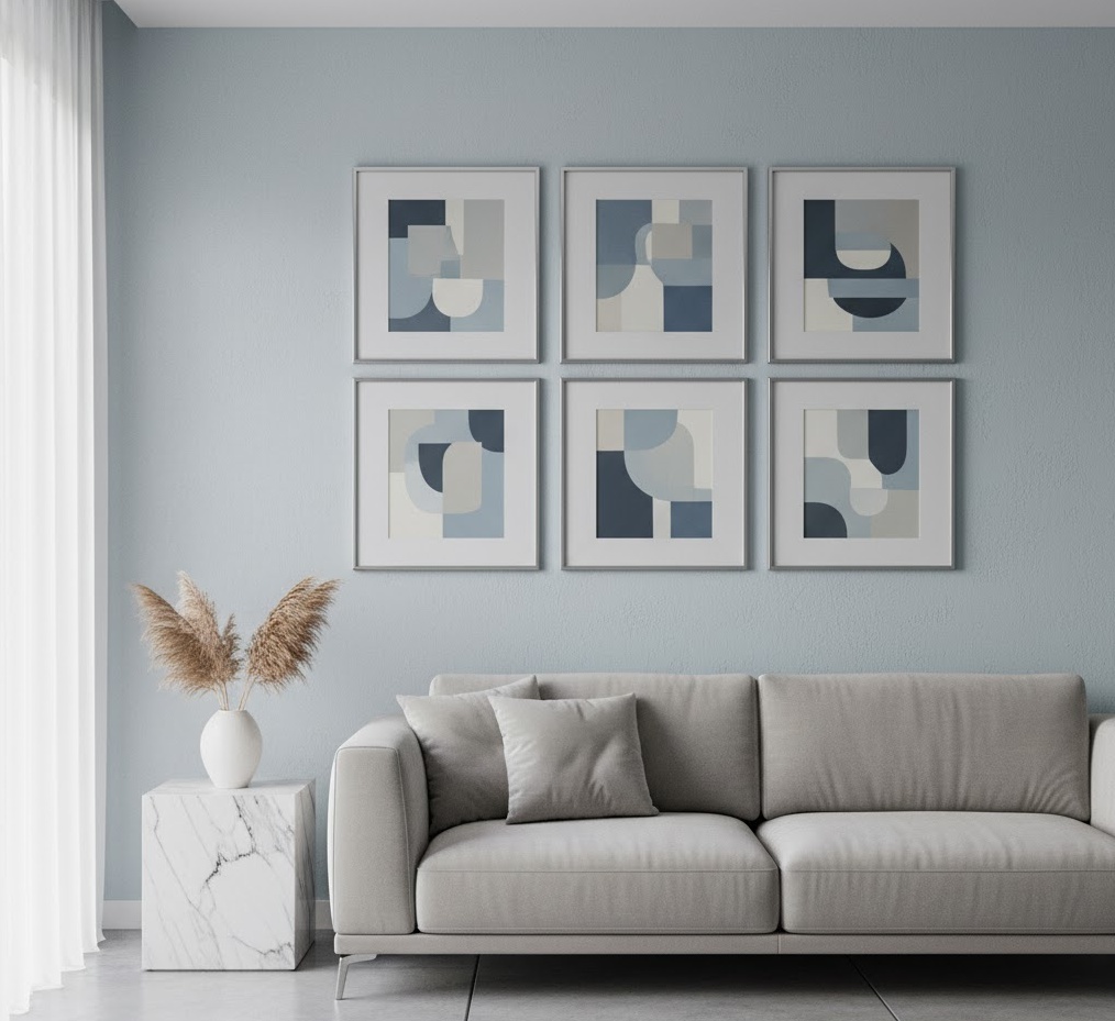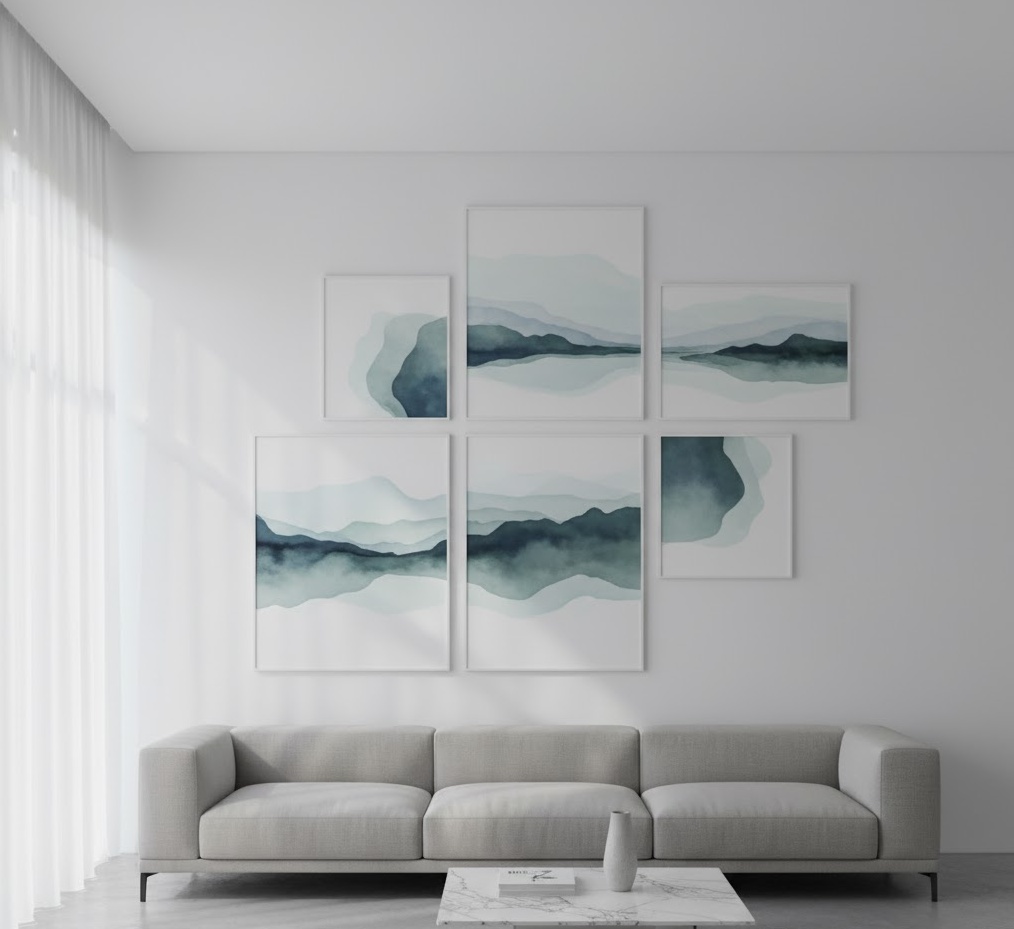 A frameless gallery wall look in the living room offers a contemporary and seamless aesthetic, allowing the artwork to float directly on the wall. This modern style typically features canvas prints, art on wood panels, or prints mounted on acrylic, creating a clean and uninterrupted visual flow. The absence of frames gives a minimalist and airy mood, making the art feel integrated into the architecture of the room. The focus is entirely on the imagery and its composition, often with a consistent theme or colour scheme to maintain cohesion. This gallery wall living room design is highly functional for achieving a sleek, gallery-like presentation, perfect for showcasing large-scale pieces or a series.