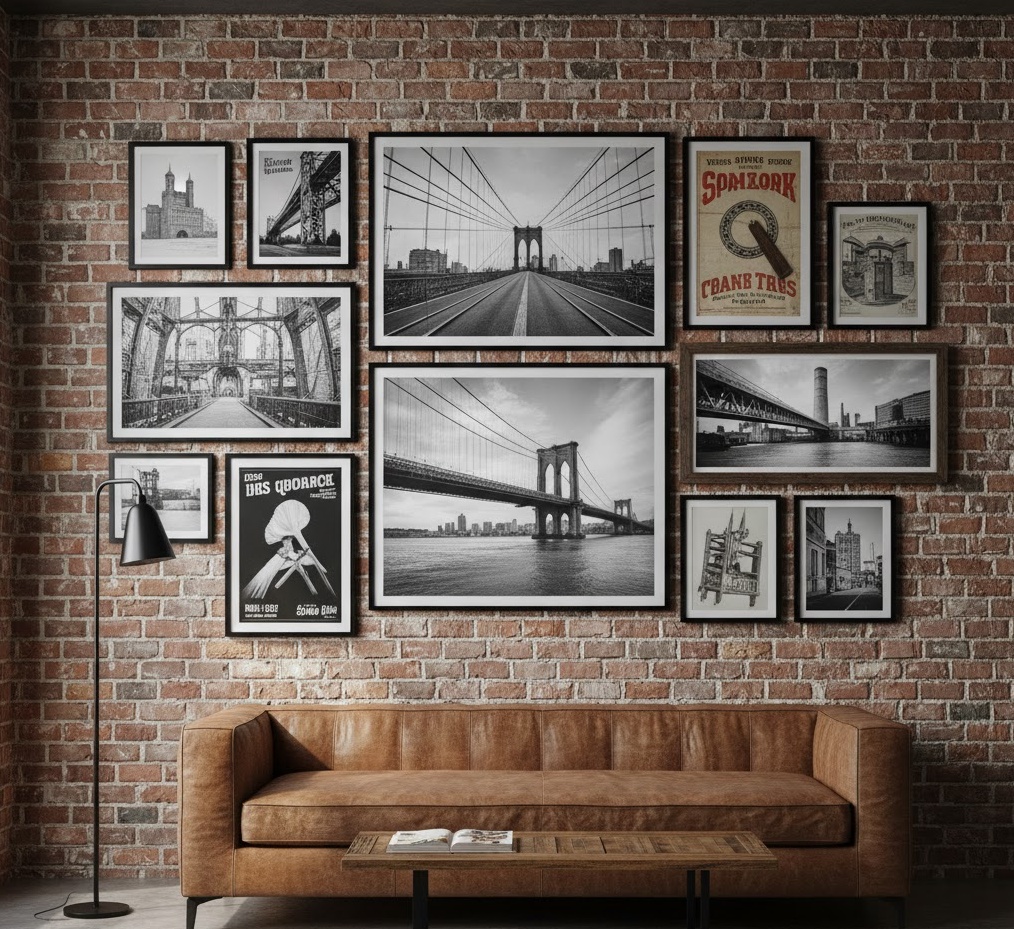 An industrial gallery wall style in the living room embraces raw, utilitarian aesthetics, blending urban grit with artistic expression. This look often features black and white photography, architectural prints, vintage advertisements, or metallic art pieces, creating a robust and edgy mood. Frames are typically made of black metal, distressed wood, or even unframed canvases, reflecting the raw material focus. The colour palette leans towards muted tones of grey, black, white, and earthy browns, with occasional pops of rust or deep red. This gallery wall living room design is highly functional for adding character to loft-style apartments or modern homes, celebrating the beauty of exposed elements and functional design.