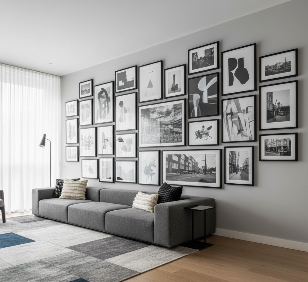 A large scale gallery wall in the living room makes a dramatic and impactful statement, covering a significant portion of the wall or even an entire wall. This ambitious style typically features a high density of frames, often varying in size and orientation, creating an immersive and grand visual experience. The mood is bold and impressive, transforming the living room into a personal art exhibition. Artwork can be diverse, from abstract to photography, unified by a consistent frame colour or a cohesive theme. This gallery wall living room design is highly functional for filling expansive walls, drawing the eye, and creating an undeniable focal point that defines the entire space.