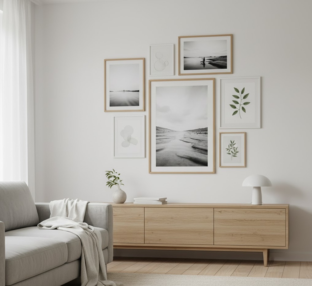 A Scandinavian gallery wall in the living room embodies simplicity, functionality, and a connection to nature, creating a bright and airy atmosphere. This style typically features minimalist prints, abstract art, black and white photography, and botanical illustrations, all contributing to a calm and uncluttered mood. Frames are predominantly light wood, white, or black, with clean lines, reflecting the understated elegance of Nordic design. The colour palette is often dominated by whites, greys, and muted pastels, with natural wood tones providing warmth. This gallery wall living room design is highly functional for enhancing natural light and promoting a serene, hygge-inspired living space.