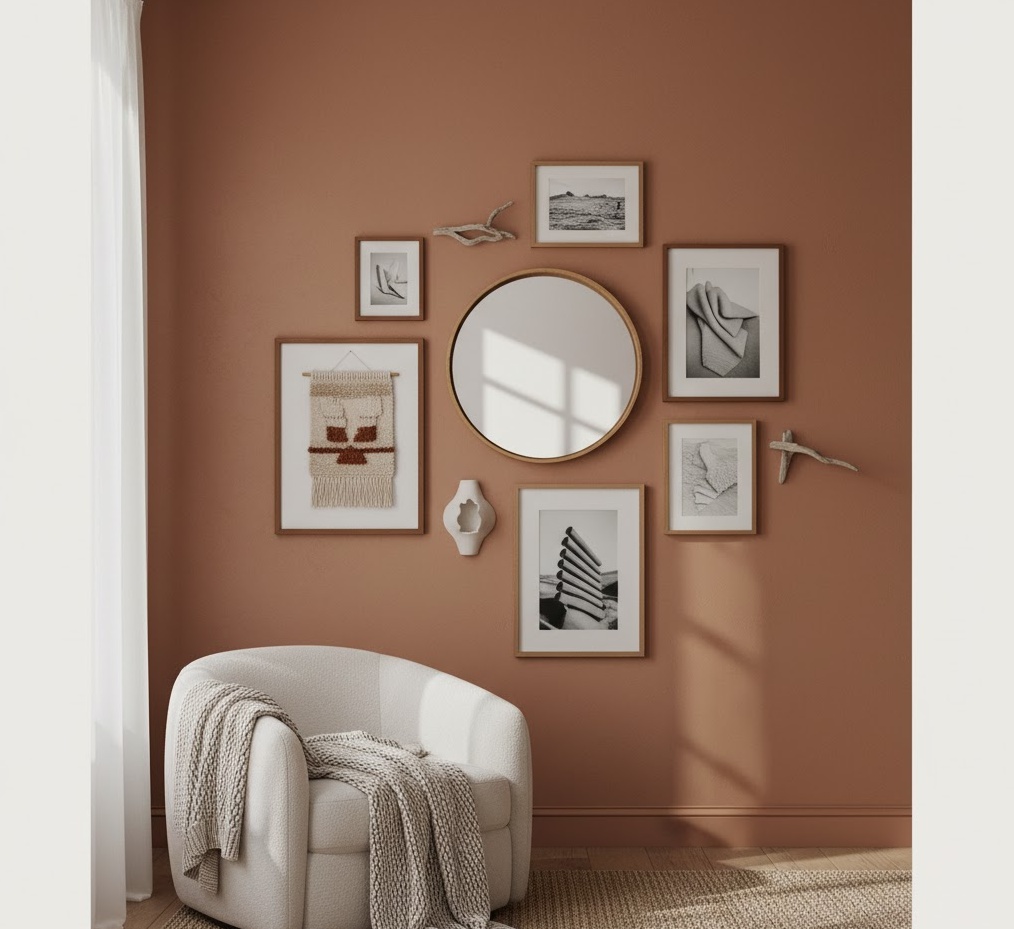 A textural gallery wall design in the living room goes beyond flat images, incorporating elements that add tactile depth and visual interest. This innovative style features a mix of framed art alongside woven pieces, small sculptural elements, mirrors, or even fabric swatches, creating a rich and engaging sensory experience. The mood is sophisticated and layered, inviting closer inspection and interaction. Materials are diverse, including wood, metal, textiles, and glass, often unified by a consistent colour palette or theme. This gallery wall living room design is highly functional for adding unique character and warmth, transforming a flat wall into a dynamic, three-dimensional art installation.