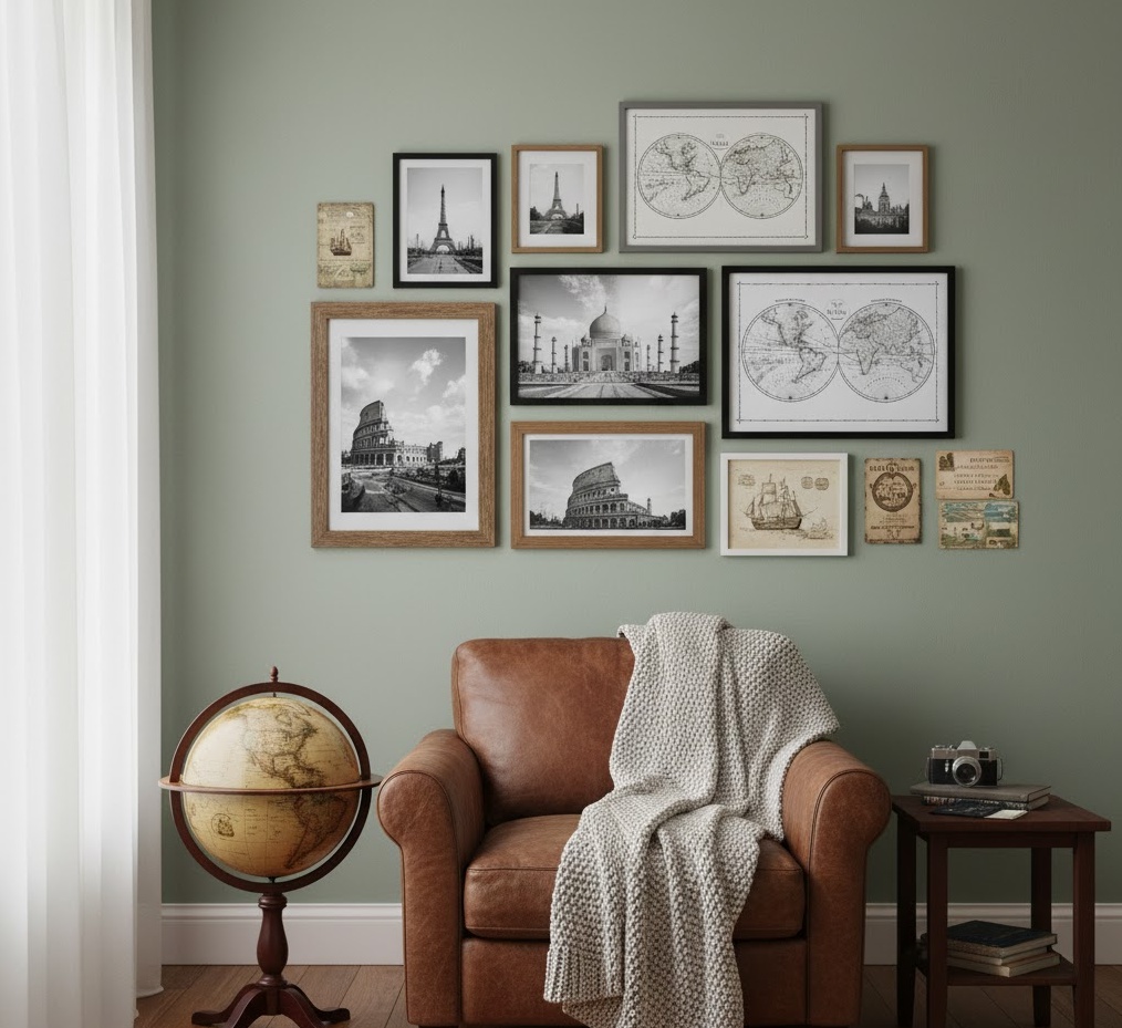 A travel themed gallery wall in the living room serves as a visual diary of adventures, inspiring wanderlust and sharing global experiences. This style typically features photographs from trips, vintage maps, postcards, and souvenirs, creating an adventurous and evocative mood. Frames can be varied, perhaps incorporating distressed wood for a rustic feel or sleek metal for a modern touch, reflecting different destinations. The colour palette often includes earthy tones, blues, and greens, reminiscent of landscapes and seascapes. This gallery wall living room design is highly functional for personalising a space with meaningful memories, sparking conversations and dreams of future journeys.