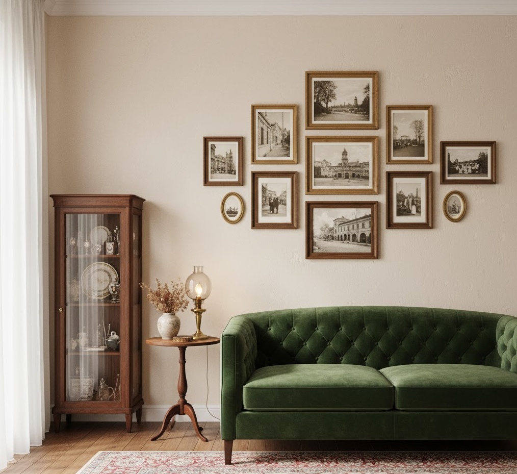 A vintage photo gallery wall in the living room evokes a sense of nostalgia and timeless charm, celebrating cherished memories and historical aesthetics. This style predominantly features black and white or sepia-toned photographs, often of family, landscapes, or iconic moments, creating a deeply personal and sentimental mood. Frames are typically ornate, distressed, or classic wooden styles, adding to the antique feel and varied textures. The arrangement can be formal and symmetrical or more organic and free-flowing, depending on the desired visual impact. This gallery wall living room design offers a warm, inviting atmosphere, transforming personal history into a beautiful, functional display that tells a story.