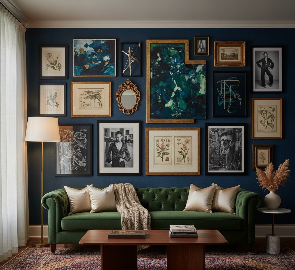 A mixed media gallery wall in the living room is a creative and expressive display that combines various artistic forms beyond traditional prints. This dynamic style might include paintings, drawings, photographs, small sculptures, textiles, and even found objects, creating a rich tapestry of textures and narratives. The mood is often artistic, personal, and highly engaging, reflecting a collector’s passion and diverse interests. Frames can vary wildly in style, material, and colour, adding to the eclectic charm and visual depth. This gallery wall living room design is highly functional for showcasing a truly unique collection, transforming the wall into a vibrant, multi-dimensional story.