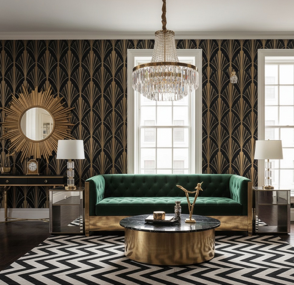 Step into the opulent and glamorous world of Art Deco design, a style that emerged in the 1920s and 30s, celebrating luxury, symmetry, and geometric patterns. This aesthetic is characterised by bold shapes, rich colours, and lavish materials, exuding sophistication and drama. Key materials include polished chrome, brass, lacquered wood, mirrored surfaces, velvet, and exotic woods, creating a sense of grandeur. The colour palette is often deep and jewel-toned, featuring emerald green, sapphire blue, ruby red, and black, accented with gold or silver. Functionality is about making a statement, with decorative yet comfortable furnishings. The mood is one of extravagance and elegance, perfect for those who appreciate historical glamour. Art Deco home decor and design ideas offer a timeless appeal, bringing a touch of vintage luxury to any space.