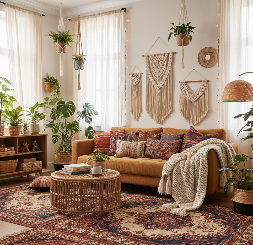 Dive into the free-spirited charm of Bohemian design ideas, a style that celebrates individuality, global influences, and a relaxed, eclectic vibe. This aesthetic is characterised by a rich tapestry of textures, patterns, and colours, often drawing inspiration from Moroccan, Indian, and tribal motifs. Materials like rattan, macramé, natural wood, and woven textiles are prominent, creating a layered and inviting atmosphere. The colour palette is warm and earthy, featuring deep reds, oranges, greens, and blues, often accented with metallics. Functionality is about comfort and casual living, with plush cushions, floor seating, and an abundance of plants. Bohemian home decor encourages a collected look, telling a story through unique finds and handcrafted items, making every corner feel personal and cosy.