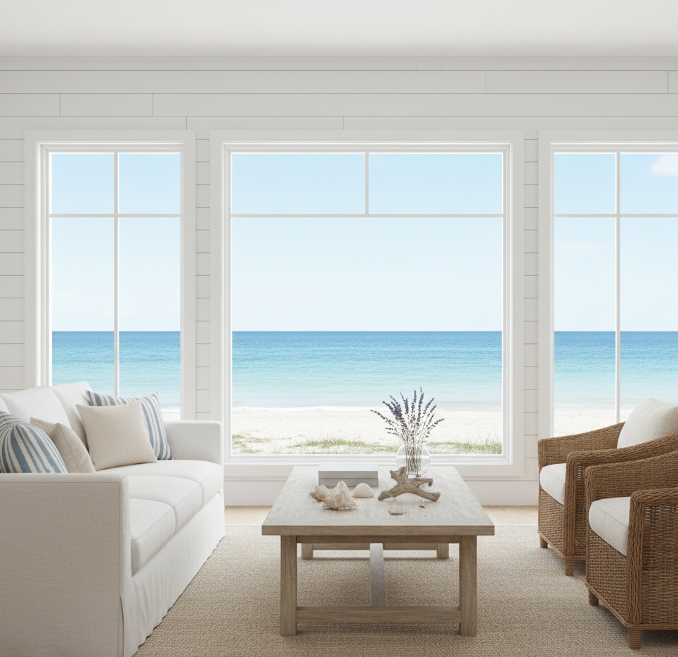 Immerse yourself in the refreshing tranquility of coastal living design, a style that evokes the serene beauty of the seaside. This aesthetic is characterised by a light, airy feel, drawing inspiration from beach houses and ocean vistas. Key materials include natural fibres like linen and cotton, weathered wood, wicker, and subtle nautical accents, creating a relaxed and inviting atmosphere. The colour palette is dominated by crisp whites, sandy beiges, and various shades of blue and green, reminiscent of the sea and sky. Functionality is about comfort and ease, with plush seating and open spaces that encourage relaxation. The mood is one of calm and rejuvenation, bringing the peaceful essence of the beach indoors. Coastal home decor and design ideas create a bright, breezy sanctuary perfect for unwinding.