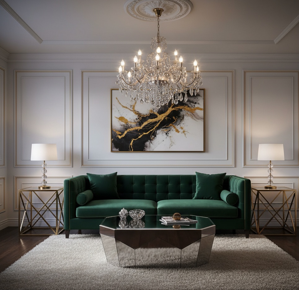 Elevate your home with glamorous interior design, a style that exudes luxury, sophistication, and a touch of Hollywood Regency flair. This aesthetic is characterised by its opulent materials, reflective surfaces, and dramatic accents, creating a truly show-stopping environment. Key materials include velvet, silk, polished chrome, brass, mirrored furniture, and crystal, often paired with high-gloss finishes. The colour palette is rich and bold, featuring deep jewel tones like sapphire and emerald, alongside classic black, white, and metallic gold or silver. Functionality is about creating a visually stunning space that also offers comfort and elegance. The mood is one of extravagance and refined taste, making glamorous home decor and design ideas perfect for those who desire a luxurious and impactful home.