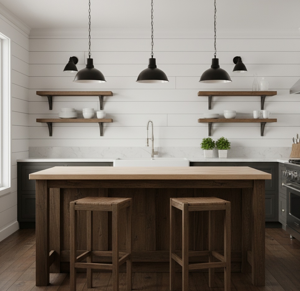 Experience the charming blend of rustic warmth and contemporary elegance with modern farmhouse decor. This popular style combines the cosy, inviting feel of traditional farmhouses with sleek, updated elements. Key materials include reclaimed wood, shiplap, galvanised metal, and natural fabrics like cotton and linen, creating a sense of authenticity and comfort. The colour palette is typically neutral, featuring whites, creams, greys, and soft blacks, often accented with natural greens or blues. Functionality is about practical, family-friendly spaces with ample seating and storage. The mood is welcoming and relaxed, offering a sophisticated yet unpretentious living environment. Modern farmhouse home decor and design ideas create a harmonious balance between old-world charm and contemporary sophistication, perfect for a comfortable family home.