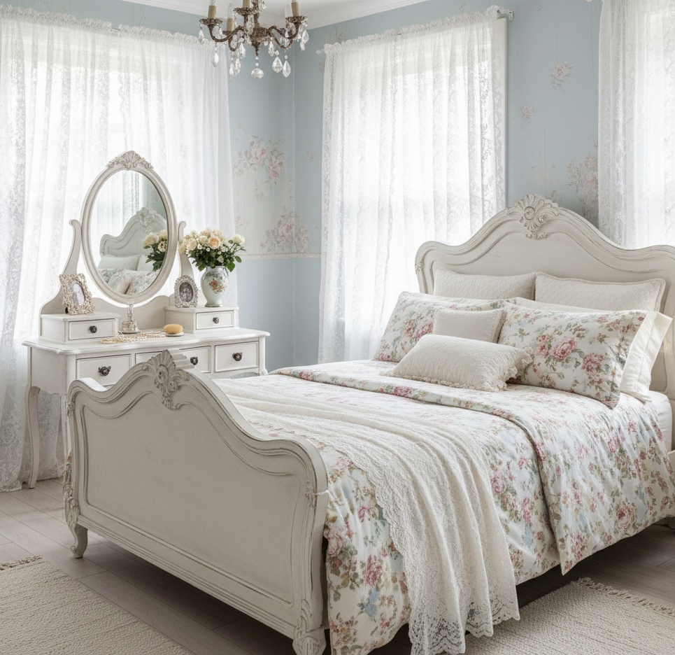 Indulge in the romantic and whimsical charm of shabby chic decorating, a style that celebrates vintage elegance, distressed finishes, and a soft, feminine aesthetic. This look is characterised by its comfortable, lived-in feel, often featuring antique or repurposed furniture with a gently worn appearance. Key materials include painted and distressed wood, wrought iron, lace, linen, and floral fabrics, creating a delicate and inviting atmosphere. The colour palette is predominantly soft pastels, such as pale pinks, mint greens, baby blues, and creamy whites, often with subtle floral patterns. Functionality is about creating a cosy, charming sanctuary with a nostalgic touch. The mood is one of gentle romance and relaxed comfort, making shabby chic home decor and design ideas perfect for a dreamy, personal space.