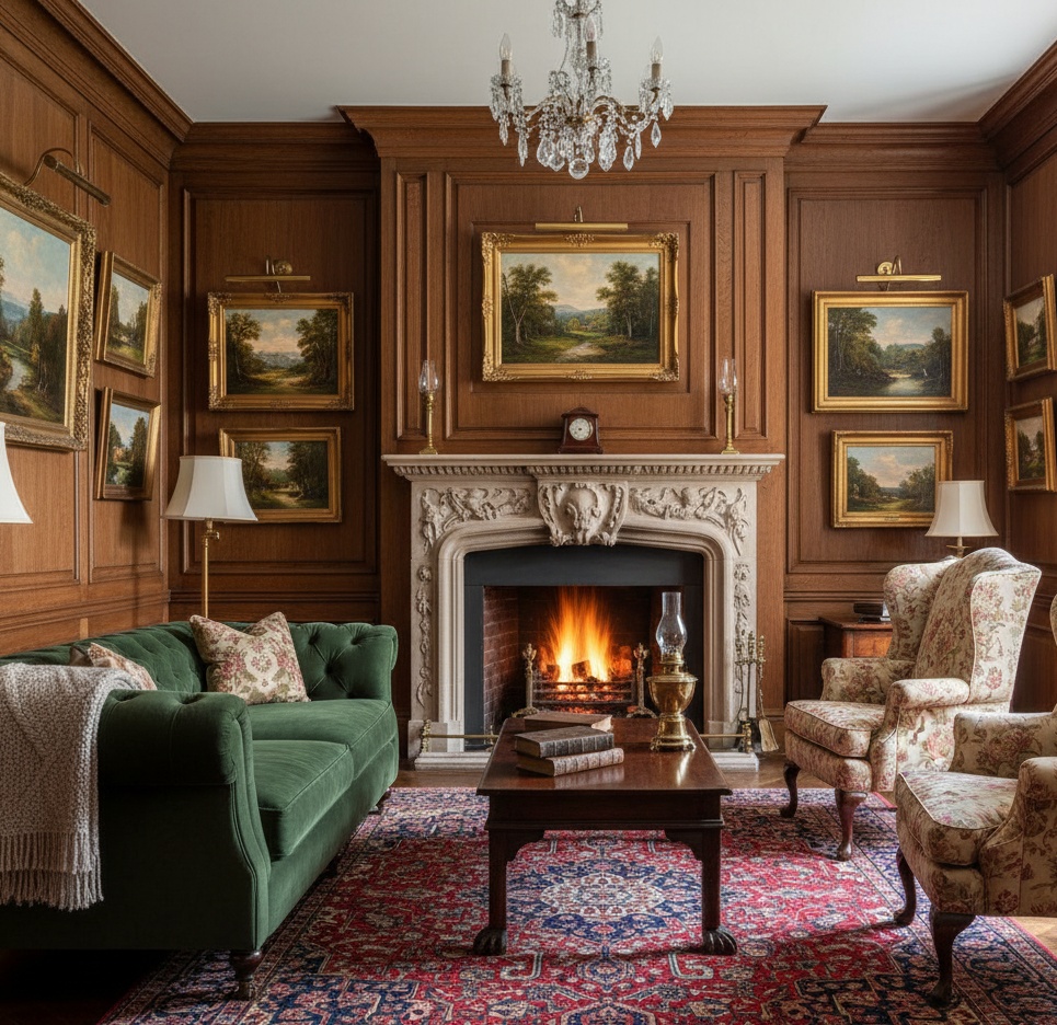 Immerse yourself in the enduring elegance of Traditional English style, a classic aesthetic that embodies comfort, history, and refined taste. This look is characterised by its rich textures, antique furnishings, and a sense of timeless sophistication, often featuring elements reminiscent of grand country estates. Key materials include dark polished wood, rich upholstery fabrics like velvet and damask, brass, and intricate patterns such as florals and plaids. The colour palette is typically deep and warm, featuring forest greens, burgundy reds, navy blues, and earthy browns, creating a cosy and inviting atmosphere. Functionality is about creating comfortable, formal spaces perfect for entertaining and relaxation. The mood is one of dignified charm and heritage, making Traditional English home decor and design ideas perfect for a classic, stately home.