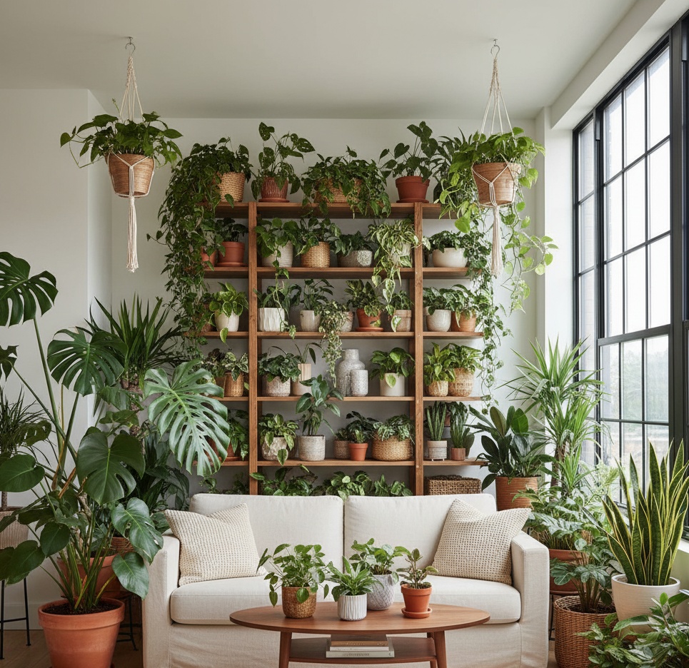 Transform your urban dwelling into a lush oasis with urban jungle decor, a vibrant style that brings the invigorating power of nature indoors. This aesthetic is defined by an abundance of houseplants, creating a refreshing and lively atmosphere within city spaces. Key materials include natural wood, rattan, macramé, and terracotta, often combined with minimalist or industrial elements to balance the greenery. The colour palette is predominantly green from the plants, complemented by earthy tones, whites, and occasional pops of vibrant colour from pots or textiles. Functionality is about creating a breathable, calming environment that enhances air quality and well-being. The mood is one of freshness, vitality, and a peaceful escape from city life, making urban jungle home decor and design ideas perfect for nature lovers.