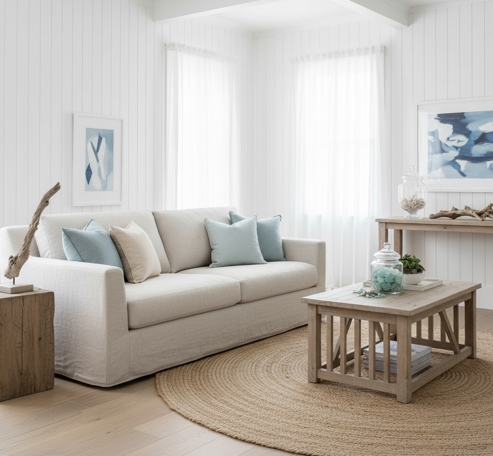 Coastal home decorating ideas evoke the serene and refreshing ambiance of the seaside, perfect for creating a relaxed and airy interior. This style typically employs a light and bright colour palette, dominated by crisp whites, soft blues, sandy beiges, and natural greens, reflecting the ocean and beach. Natural materials are paramount, including weathered wood, rattan, linen, and cotton, which add texture and an organic feel. Functionality is achieved through comfortable, durable furnishings and clever storage that keeps clutter at bay, maintaining an open, breezy feel. The mood is one of tranquil escapism and casual elegance, making it an ideal choice for house ideas for remodeling, decorating and maximizing space that feels both inviting and expansive, regardless of its actual size.