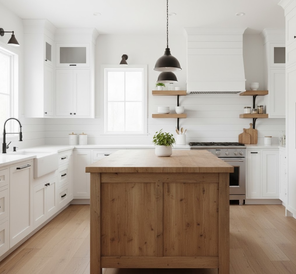 Modern farmhouse remodel decor blends rustic charm with contemporary sophistication, creating warm, inviting, and highly functional spaces. This style features a neutral colour palette of whites, creams, greys, and black, often accented with natural wood tones and subtle pops of colour. Materials like reclaimed wood, shiplap, exposed beams, and matte black metals are central, adding character and texture. Functionality is key, with open shelving, large kitchen islands, and practical, comfortable furniture designed for everyday living. The mood is one of relaxed elegance and homely comfort, making it a fantastic option for house ideas for remodeling, decorating and maximizing space that feels both spacious and intimate. It cleverly integrates traditional elements with modern conveniences to achieve a timeless appeal.
