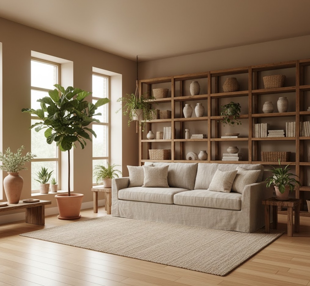 Biophilic design home remodel integrates natural elements and processes into the built environment, fostering a deeper connection with nature and enhancing well-being. This approach often features an earthy colour palette of greens, browns, blues, and natural neutrals, reflecting outdoor landscapes. Materials are predominantly organic and sustainable, including natural wood, stone, cork, and an abundance of living plants. Functionality is achieved by designing spaces that allow for natural light, fresh air, and views of nature, creating a calming and restorative atmosphere. Vertical gardens, indoor water features, and natural textures are common elements. The mood is one of serene harmony and natural balance, offering unique house ideas for remodeling, decorating and maximizing space that feels vibrant, healthy, and deeply connected to the natural world, even in urban settings.