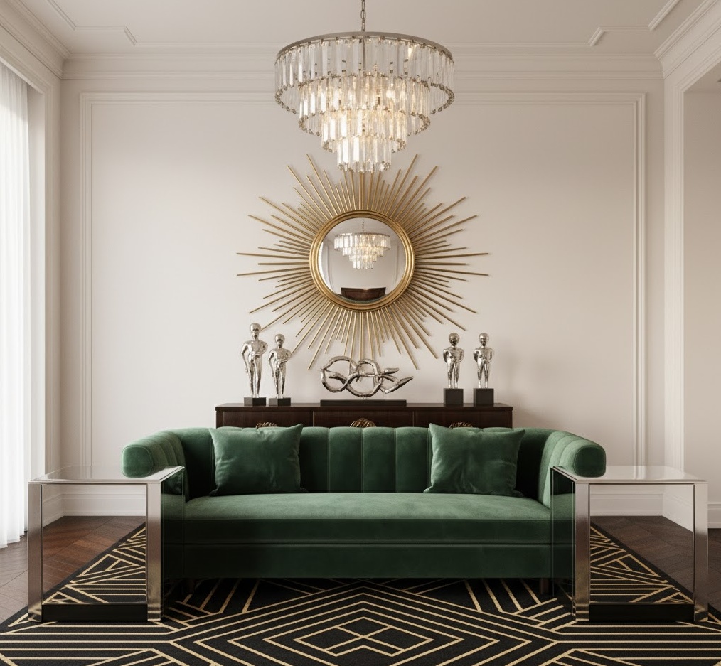 Art Deco interiors represent an opulent and glamorous interior decoration style from the 1920s and 30s, synonymous with luxury, sophistication, and a sense of grandeur. This aesthetic is defined by bold geometric patterns, rich colours, and lavish materials that exude extravagance. Think polished chrome, mirrored surfaces, lacquered wood, and exotic veneers, often accented with plush velvet, shimmering silk, and intricate inlays. The colour palette typically includes deep jewel tones like emerald green, sapphire blue, and ruby red, alongside striking metallics such as gold and silver, and stark black and white contrasts. When choosing the right look for your home, Art Deco embraces symmetry, grandeur, and a sense of theatricality, creating a truly decadent and striking environment that harks back to an era of unparalleled elegance and flair. It’s a style for those who desire a statement-making and luxurious living space.