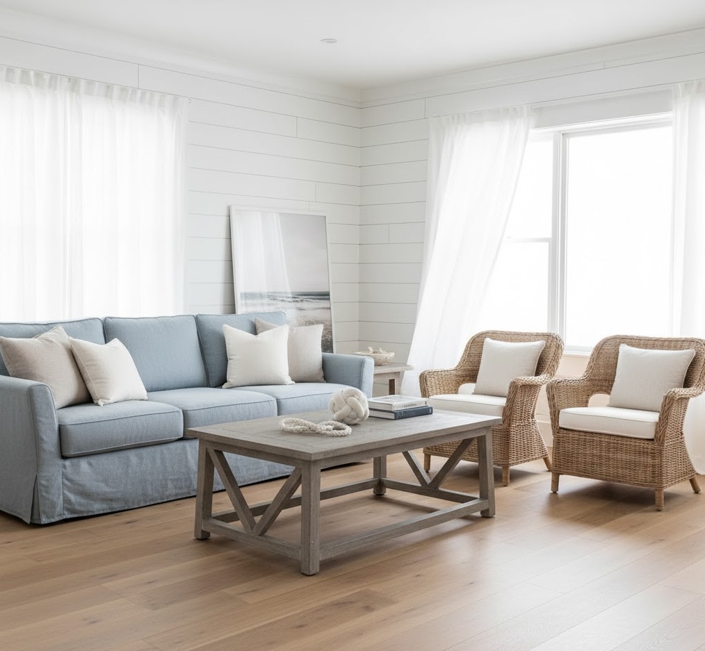 Coastal interior style is an interior decoration approach that evokes the serene and refreshing atmosphere of the seaside, offering a tranquil escape within your home. This look is characterised by a light and airy feel, often utilising a colour palette inspired by the ocean and sand – think crisp whites, various shades of blue, soft greens, and sandy neutrals. Natural materials are paramount, including weathered wood, wicker, rattan, and linen, which contribute to its relaxed, breezy charm and authentic texture. When choosing the right look for your home, Coastal design incorporates elements like seashells, driftwood, and subtle nautical accents, but always in a refined, understated manner to avoid cliché. The mood is typically calm, inviting, and effortlessly chic, perfect for creating a tranquil retreat that feels perpetually on holiday. It’s about bringing the soothing essence of the beach into your living space, promoting relaxation and a sense of openness.
