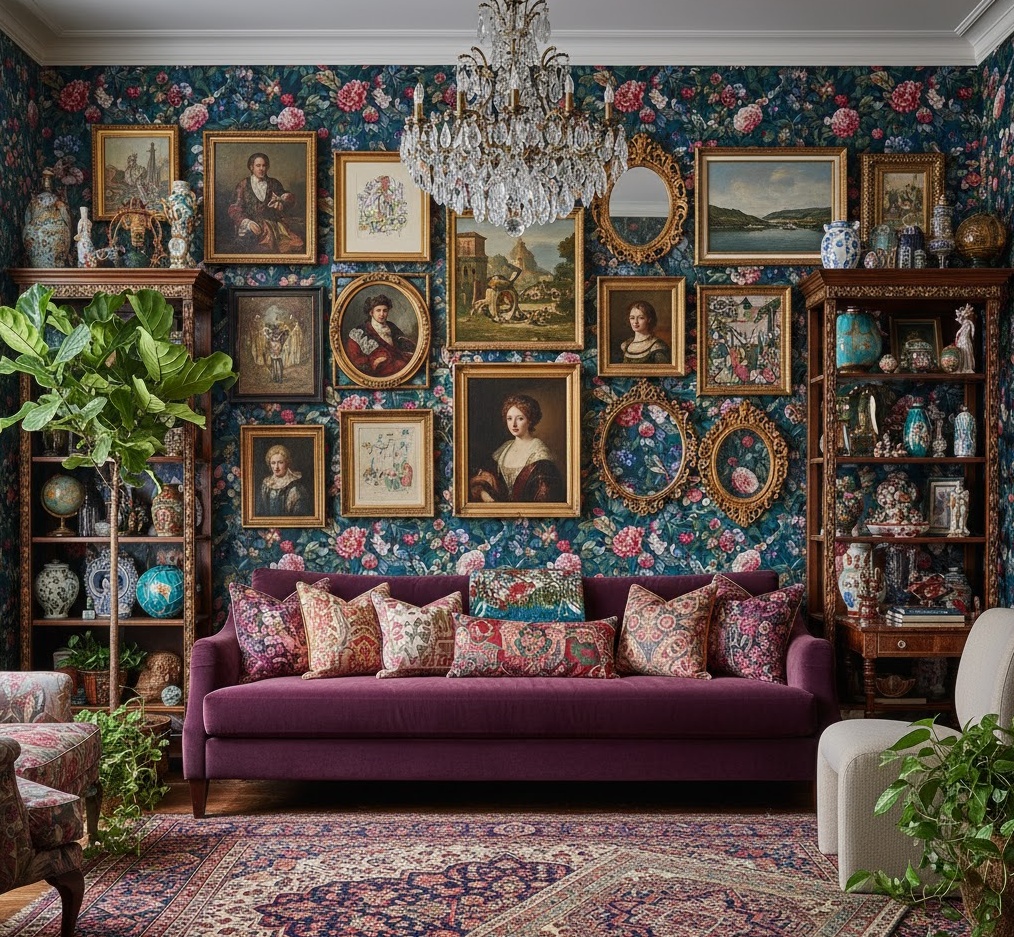 Maximalist interior design is an exuberant and bold approach to interior decoration that embraces abundance, rich patterns, and a “more is more” philosophy, standing in joyful contrast to minimalist trends. This style is a vibrant celebration of a curated collection of diverse items, colours, and textures, reflecting a homeowner’s unique personality. The colour palette is often vibrant and daring, featuring clashing patterns, bold hues, and an array of prints, from floral to geometric, creating a visually stimulating environment. Materials are luxurious and varied, including velvet, silk, brocade, polished wood, and ornate metals, layered to create depth. When choosing the right look for your home, Maximalist design encourages layering, personal expression, and a sense of playful grandeur, creating a visually stimulating and deeply personal space that tells a rich, intricate story. It’s about surrounding yourself with things you love, without reservation.