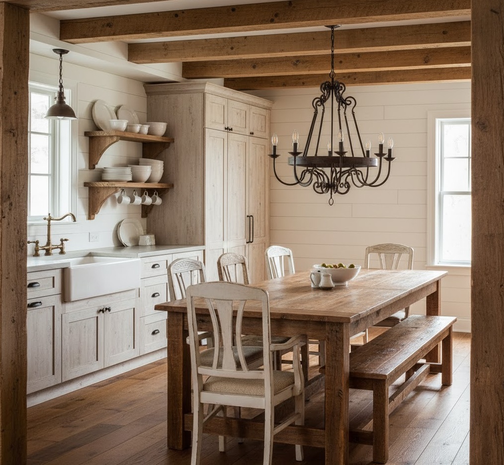 Rustic Farmhouse decor is an interior decoration style that beautifully blends country charm with a touch of modern sophistication, creating a warm and inviting atmosphere. This look celebrates natural textures, vintage elements, and a sense of history, making it a comforting choice among interior decoration styles explained. Key materials include reclaimed wood, distressed metals, wrought iron, and natural fibres like cotton and linen, all contributing to its authentic, lived-in feel. The colour palette typically features warm neutrals, whites, creams, and soft greys, often accented with muted blues or greens to add a touch of subtle colour. When choosing the right look for your home, Farmhouse style embraces imperfections and handmade items, creating a sense of comfort and nostalgia. Functionality is paramount, with practical yet charming furnishings that evoke a simpler, more wholesome way of living, perfect for a family-friendly and welcoming home.