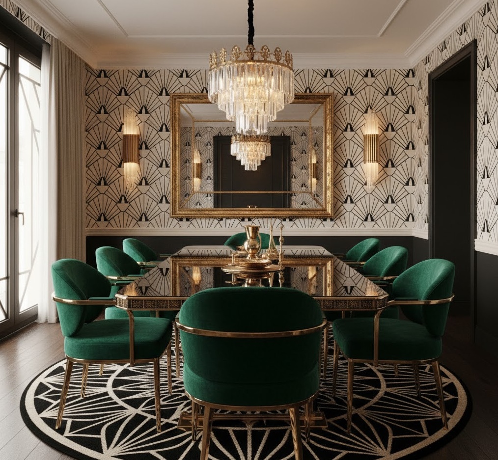 Art Deco interior home decor ideas exude glamour, luxury, and geometric sophistication, harking back to the roaring twenties and thirties. This opulent style is characterised by bold geometric patterns, rich jewel tones like emerald green, sapphire blue, and ruby red, often contrasted with black, white, and gold or silver accents. Materials are lavish, including polished chrome, brass, lacquered wood, mirrored surfaces, velvet, and exotic animal prints. The mood is undeniably luxurious and dramatic, creating a sense of grandeur and elegance. Practical tips involve incorporating statement lighting, geometric motifs, and high-gloss finishes to transform any room into a dazzling, vintage-inspired sanctuary.