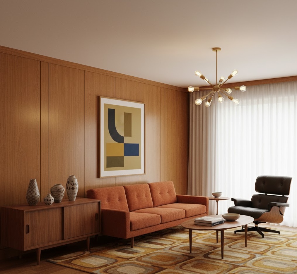 Mid Century Modern interior home decor ideas are defined by clean lines, organic shapes, and a focus on functionality and innovative materials from the mid-20th century. The colour palette often features a mix of earthy tones like avocado green, mustard yellow, and burnt orange, alongside neutrals and teak wood. Materials include teak, walnut, plywood, plastic, and glass, showcasing a blend of natural and man-made elements. The mood is optimistic, stylish, and comfortable, reflecting a post-war era of design innovation. Practical tips involve investing in iconic furniture pieces and incorporating Sputnik chandeliers to transform rooms into timeless, sophisticated spaces.