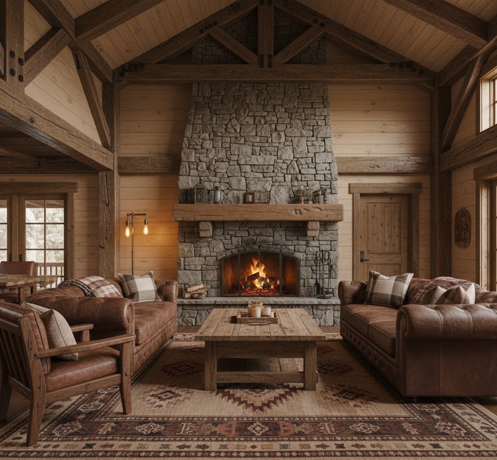 Rustic Cabin interior home decor tips embrace the raw beauty of nature, creating warm, inviting, and rugged spaces reminiscent of a mountain retreat. This style is characterised by a dominance of natural wood, stone, and earthy tones like deep browns, forest greens, and warm reds. Materials are unrefined and authentic, including exposed timber beams, stone fireplaces, rough-hewn furniture, and natural fibres like wool and leather. The mood is cosy, robust, and comforting, offering a strong connection to the outdoors. Practical tips involve incorporating vintage hunting lodge elements and natural textures to transform any room into a charming, rustic sanctuary.