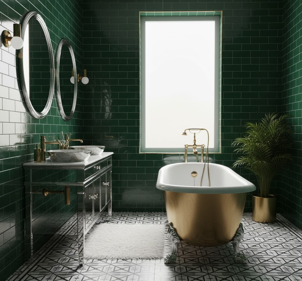 Step back into an era of glamour and extravagance with an Art Deco opulent bathroom. This style is characterised by bold geometric patterns, rich colours, and luxurious materials. Think polished chrome or gold fixtures, black and white checkerboard floors, and mirrored surfaces that reflect light beautifully. Deep jewel tones like emerald green, sapphire blue, or ruby red often feature prominently, creating a dramatic and sophisticated mood. Functionality is blended with ornate detailing, from stepped vanities to decorative lighting, ensuring a truly lavish and unique luxury bathroom experience.