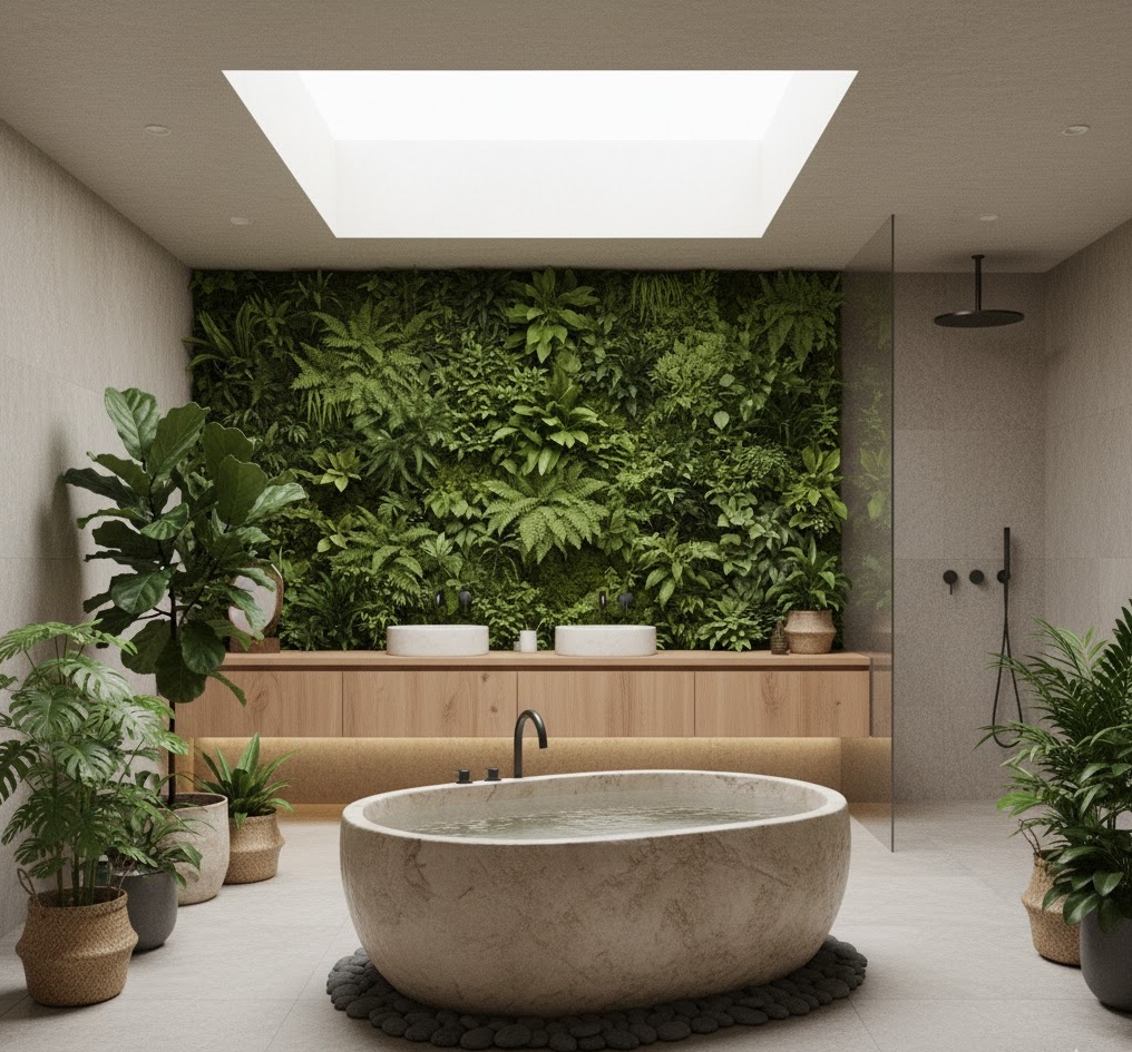 Connect with nature in a biophilic green luxury bath, designed to bring the outdoors in. This style integrates abundant plant life, natural light, and organic materials to create a refreshing and calming environment. Think living walls, large potted plants, and natural wood or stone finishes. The colour palette is dominated by various shades of green, complemented by earthy browns and crisp whites. The mood is invigorating and peaceful, promoting well-being and a sense of connection to nature, making this luxury bathroom a vibrant sanctuary.