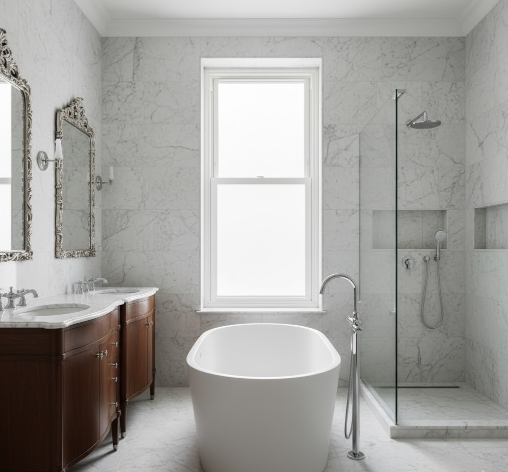 A classic marble luxury bathroom epitomises timeless elegance and grandeur. This design heavily features various types of marble, from pristine Carrara to dramatic Calacatta, used on floors, walls, and vanity tops. The colour scheme is typically light and airy, with whites, creams, and subtle grey veining dominating, creating a bright and expansive feel. Polished chrome or brushed nickel fixtures complement the stone, adding a touch of traditional sophistication. The mood is one of enduring luxury and refined taste, with functionality seamlessly integrated into the opulent surroundings.