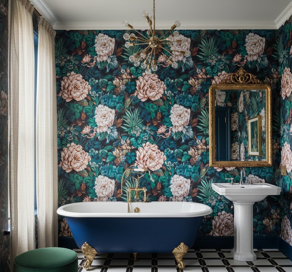 For those who dare to be different, an eclectic grandeur luxury bathroom offers a vibrant and personalised space. This design artfully mixes different styles, periods, and textures, creating a rich and visually interesting environment. Think antique mirrors paired with modern art, bold patterned wallpaper alongside classic tiling, and a mix of metallic finishes. The colour palette can be adventurous, combining unexpected hues to create a lively and luxurious mood. Functionality is tailored to individual needs, making this luxury bathroom a true reflection of unique taste and personality.