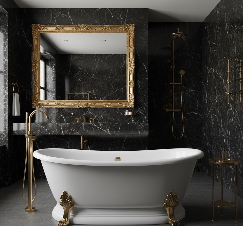 Elevate your space with a glamorous gold luxury bathroom, where opulence takes centre stage. This design heavily features gold accents, from polished brass fixtures to gilded mirrors and decorative elements. Paired with rich materials like black marble, deep velvet, or high-gloss finishes, it creates a truly lavish environment. The colour palette often includes black, white, or deep jewel tones, providing a striking contrast to the shimmering gold. The mood is one of pure indulgence and sophistication, with functionality designed to enhance the luxurious experience of this luxury bathroom.
