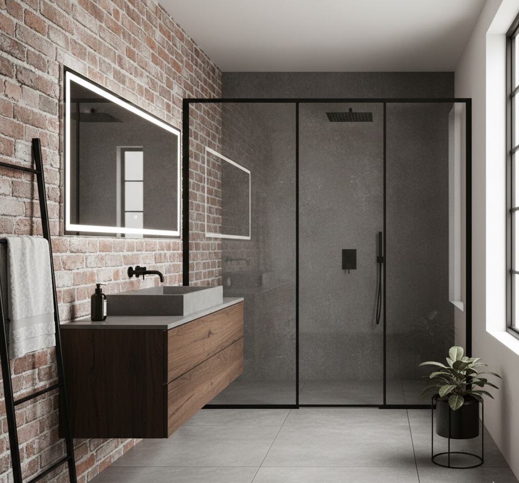 For a raw yet refined aesthetic, consider industrial luxe bathroom ideas. This design marries the ruggedness of industrial elements with luxurious finishes, creating a unique and edgy space. Exposed brick walls, concrete surfaces, and metal piping are softened by high-end fixtures, warm wood accents, and sophisticated lighting. The colour palette often includes greys, blacks, and deep browns, with metallic touches adding a touch of glamour. Functionality is robust and practical, yet the overall mood is surprisingly chic and inviting, perfect for a contemporary urban dwelling.