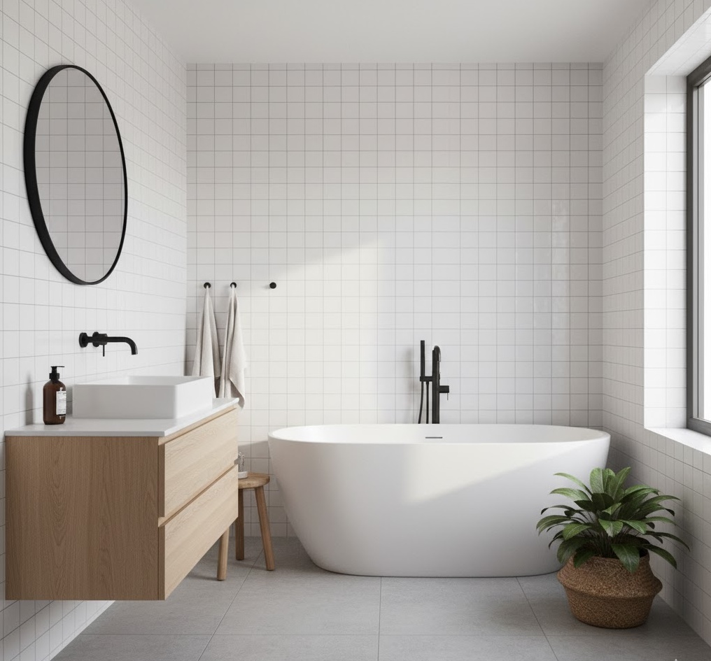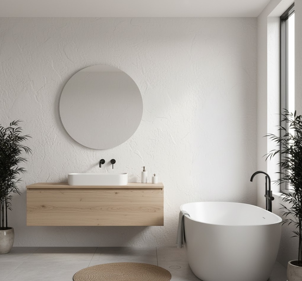The Japandi serene luxury bath blends Japanese minimalism with Scandinavian warmth, creating a harmonious and tranquil space. This design emphasises clean lines, natural materials, and a muted colour palette of whites, greys, and warm wood tones. Think simple, functional furniture, handcrafted ceramics, and subtle textural contrasts. The mood is one of calm and balance, promoting mindfulness and relaxation. Functionality is highly considered, with uncluttered surfaces and efficient layouts, ensuring a peaceful and highly aesthetic luxury bathroom that feels both modern and timeless.