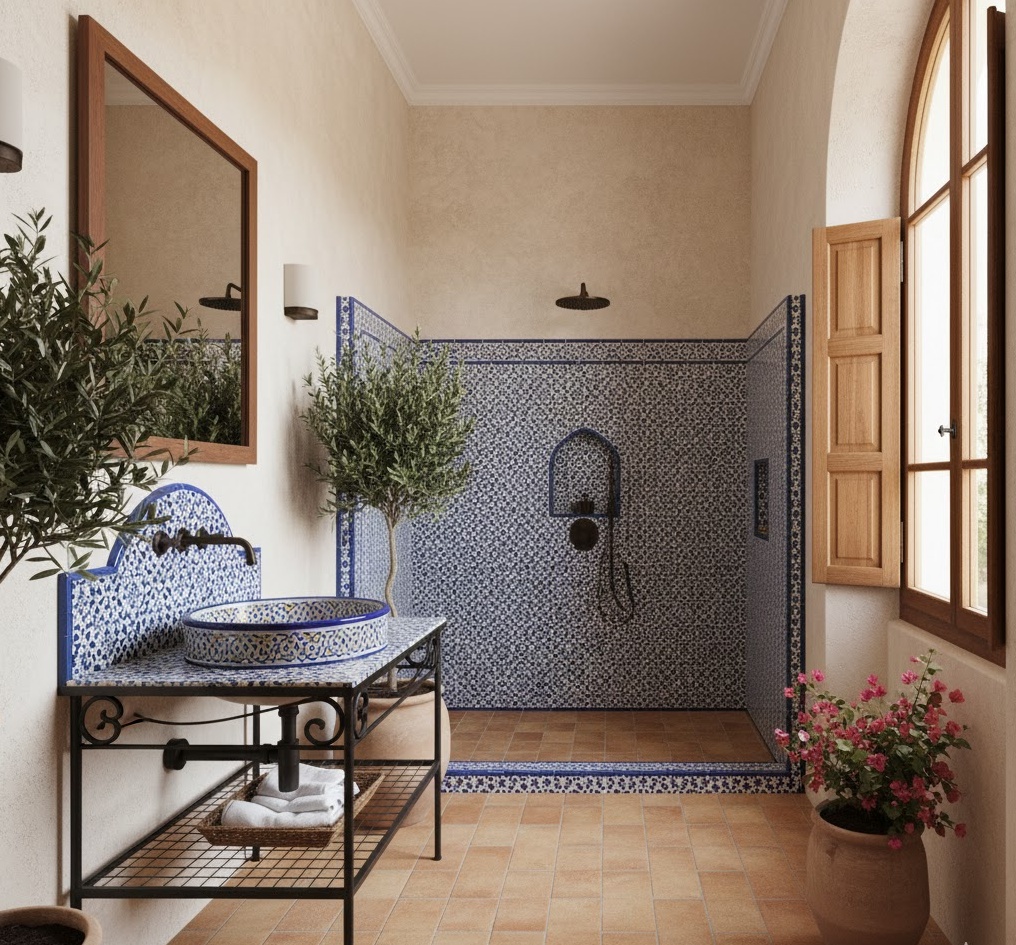 Evoke the warmth and charm of the Mediterranean with a luxury bathroom inspired by sun-drenched coasts. This design often features terracotta tiles, stucco walls, and intricate mosaic patterns. A colour palette of warm whites, deep blues, and earthy reds creates a vibrant yet relaxing mood. Natural materials like wrought iron, dark wood, and ceramic are prominent, adding to the authentic feel. Functionality is often robust and traditional, with large basins and open shelving, making this luxury bathroom a welcoming and exotic retreat.