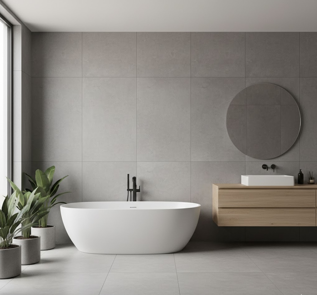 Embrace sleek lines and uncluttered spaces with a modern minimalist luxury bathroom design. This aesthetic prioritises functionality and sophisticated simplicity, often featuring large format tiles in neutral tones like grey, white, or beige. Materials such as polished concrete, smooth natural stone, and matte black fixtures create a serene yet opulent atmosphere. The mood is calm and refined, with hidden storage solutions maintaining a pristine look, ensuring every element serves a purpose while exuding understated elegance.