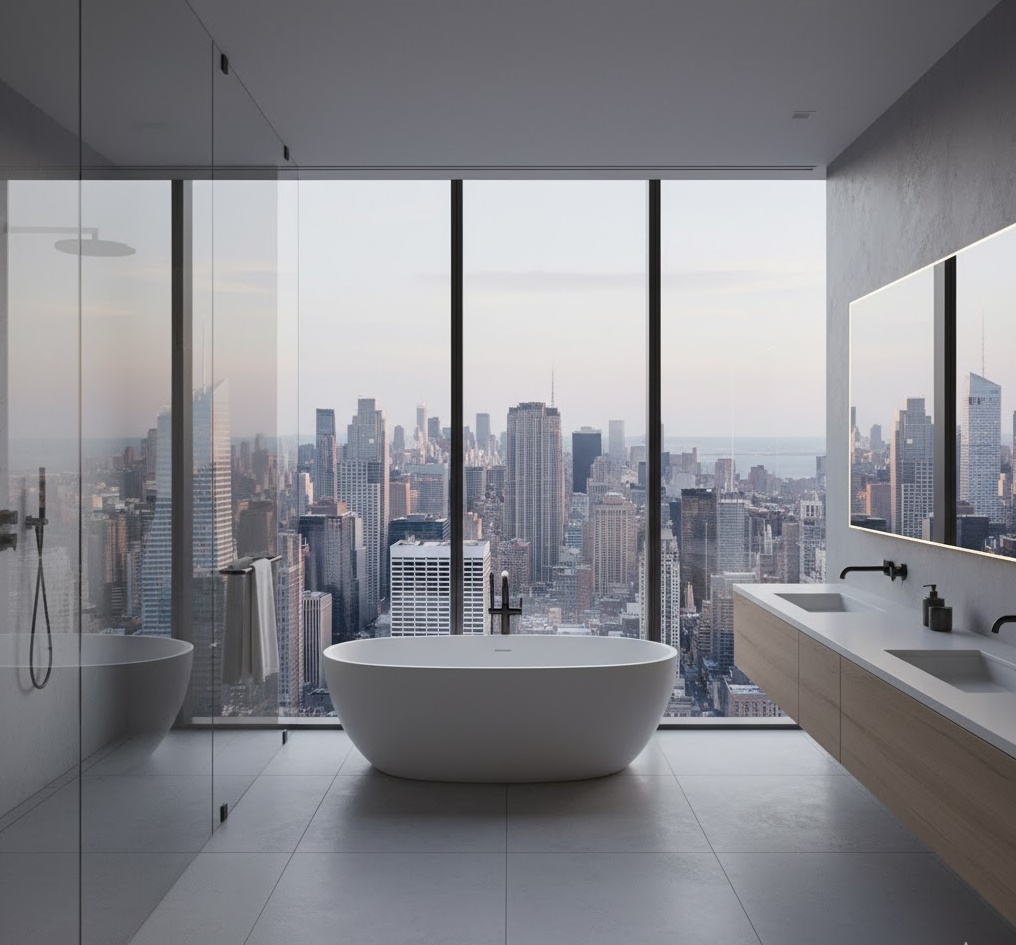 Maximise breathtaking vistas with a penthouse view luxury bathroom, where the exterior landscape becomes an integral part of the design. This style features expansive floor-to-ceiling windows, often with minimal window treatments, to frame stunning cityscapes or natural panoramas. Materials are typically sleek and reflective, such as polished stone, glass, and chrome, to enhance the sense of openness. The colour palette is often neutral, allowing the view to be the main focal point. The mood is expansive and sophisticated, with functionality designed to complement the unparalleled outlook of this luxury bathroom.
