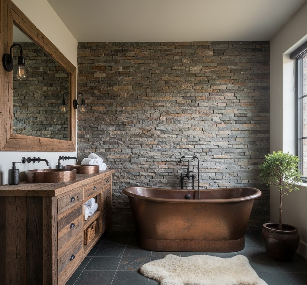 A rustic refined luxury bathroom combines the charm of natural, raw elements with sophisticated finishes. This design often features reclaimed wood beams, stone walls, and distressed metal accents, softened by plush textiles and elegant fixtures. The colour palette typically includes warm earthy tones, deep greens, and rich browns, creating a cosy yet opulent mood. Functionality is robust and practical, yet every detail is carefully curated to elevate the space, offering a unique blend of rugged beauty and high-end comfort in this luxury bathroom.