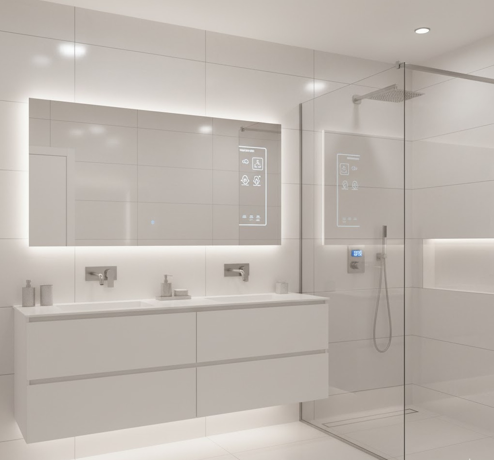 Step into the future with a smart tech luxury bathroom, where innovation meets indulgence. This design seamlessly integrates cutting-edge technology to enhance comfort and convenience. Features include smart mirrors with integrated displays, voice-activated lighting and temperature control, and high-tech shower systems with customisable settings. Materials are often sleek and modern, such as polished porcelain, glass, and minimalist fixtures. The mood is futuristic and highly functional, offering a personalised and effortless experience in this truly advanced luxury bathroom.