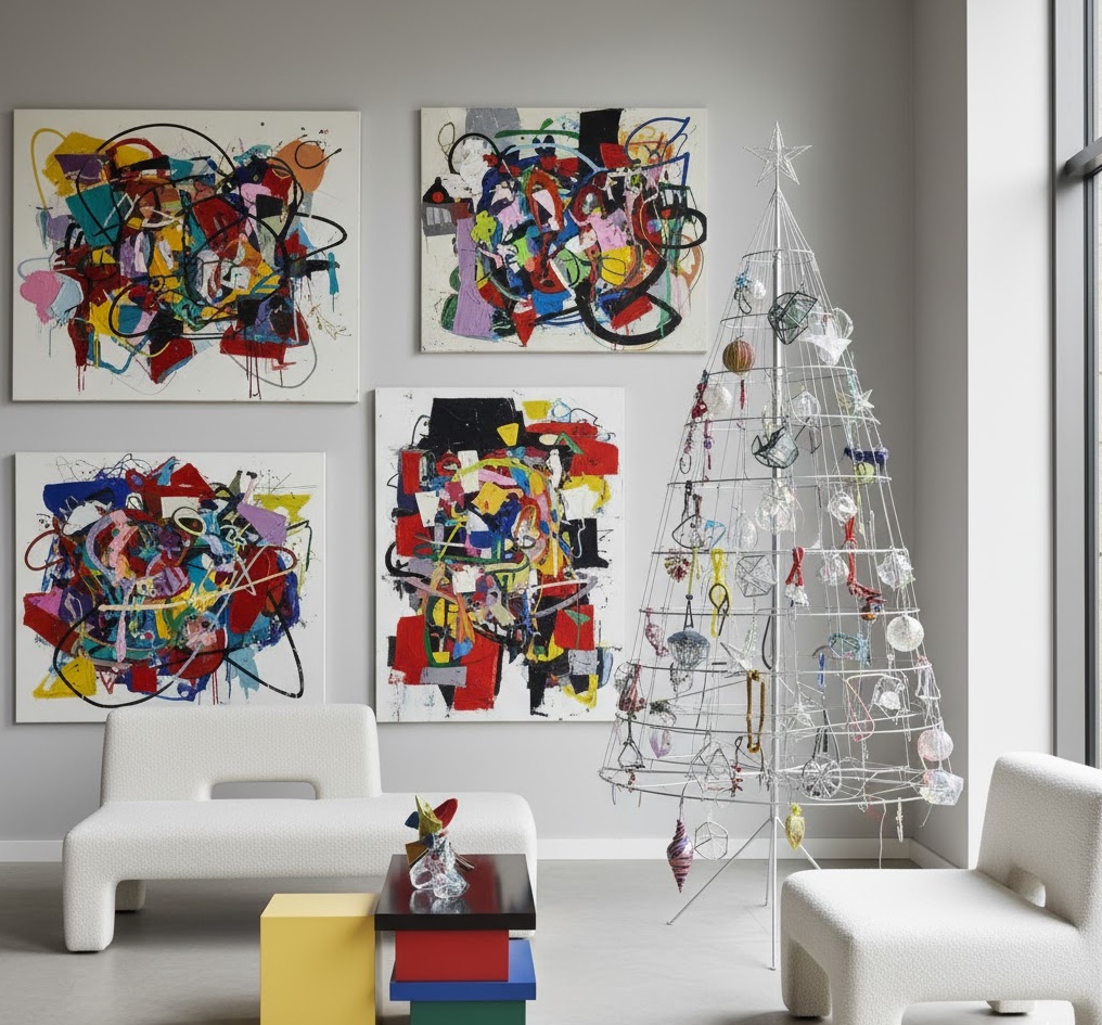 Abstract Modern Christmas Art transforms festive decor into a gallery-worthy display, focusing on non-representational forms, bold colours, and sculptural elements. This modern Christmas decor approach is about artistic expression and pushing creative boundaries. Materials often include acrylic, resin, painted wood, and unconventional textiles, all used to create unique, sculptural pieces. The colour palette can be vibrant and unexpected, featuring contrasting hues and experimental combinations, or it can be more subdued, focusing on texture and form within a limited range. Decorations are typically abstract sculptures, deconstructed shapes, and artistic installations, moving beyond traditional festive motifs. Functionality is about creating a visually stimulating and thought-provoking space that feels like a contemporary art exhibit. The mood is avant-garde, imaginative, and deeply artistic, offering a truly unique and cutting-edge interpretation of holiday cheer.