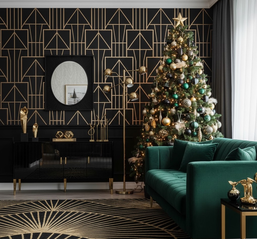 Art Deco Modern Holiday decor infuses the festive season with the glamour and geometric elegance of the 1920s and 30s, reinterpreted for a contemporary setting. This style is characterised by bold symmetry, luxurious materials, and a sense of sophisticated opulence. Materials often include polished brass, mirrored surfaces, black lacquer, velvet, and rich, dark woods, all contributing to a dramatic and refined aesthetic. The colour palette is typically rich and striking, featuring deep emerald green, sapphire blue, ruby red, or black, often contrasted with shimmering gold or silver accents. Decorations are geometric, fan-shaped, or feature intricate patterns, such as faceted baubles, feathered ornaments, and sleek metallic garlands. Functionality is about creating a visually stunning and immersive experience. The mood is one of sophisticated grandeur and timeless elegance, making this modern Christmas decor perfect for a truly luxurious and stylish celebration.