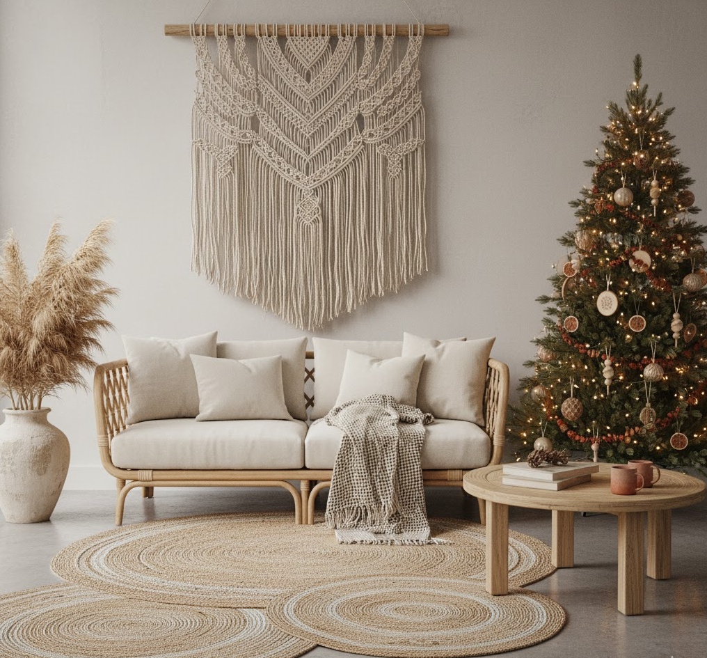 Boho Modern Festive Decor blends free-spirited bohemian charm with contemporary clean lines, creating an eclectic and inviting atmosphere. This style celebrates natural textures, global influences, and a relaxed, artistic sensibility. Key materials include macrame, woven textiles, natural wood, rattan, and dried botanicals, all contributing to an organic and earthy feel. The colour palette is warm and inviting, featuring earthy tones like terracotta, olive green, and sandy beige, often accented with pops of muted jewel tones or soft pastels. Decorations are often handmade, vintage-inspired, or globally sourced, such as woven ornaments, tassel garlands, and unique ceramic pieces. Functionality is about creating a comfortable and personal space that feels lived-in and authentic. The mood is relaxed, artistic, and full of character, offering a unique and soulful modern Christmas decor experience that embraces individuality and warmth.